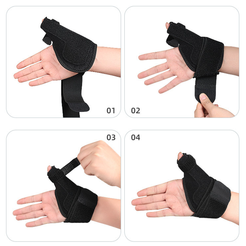 Handledsstöd med tumstöd som ger både handleden och tummen stabilitet, minskar risken för överbelastning och lindrar smärta genom värme. Det är utformat för att passa både vänster och höger hand, med justerbara remmar för optimal passform.