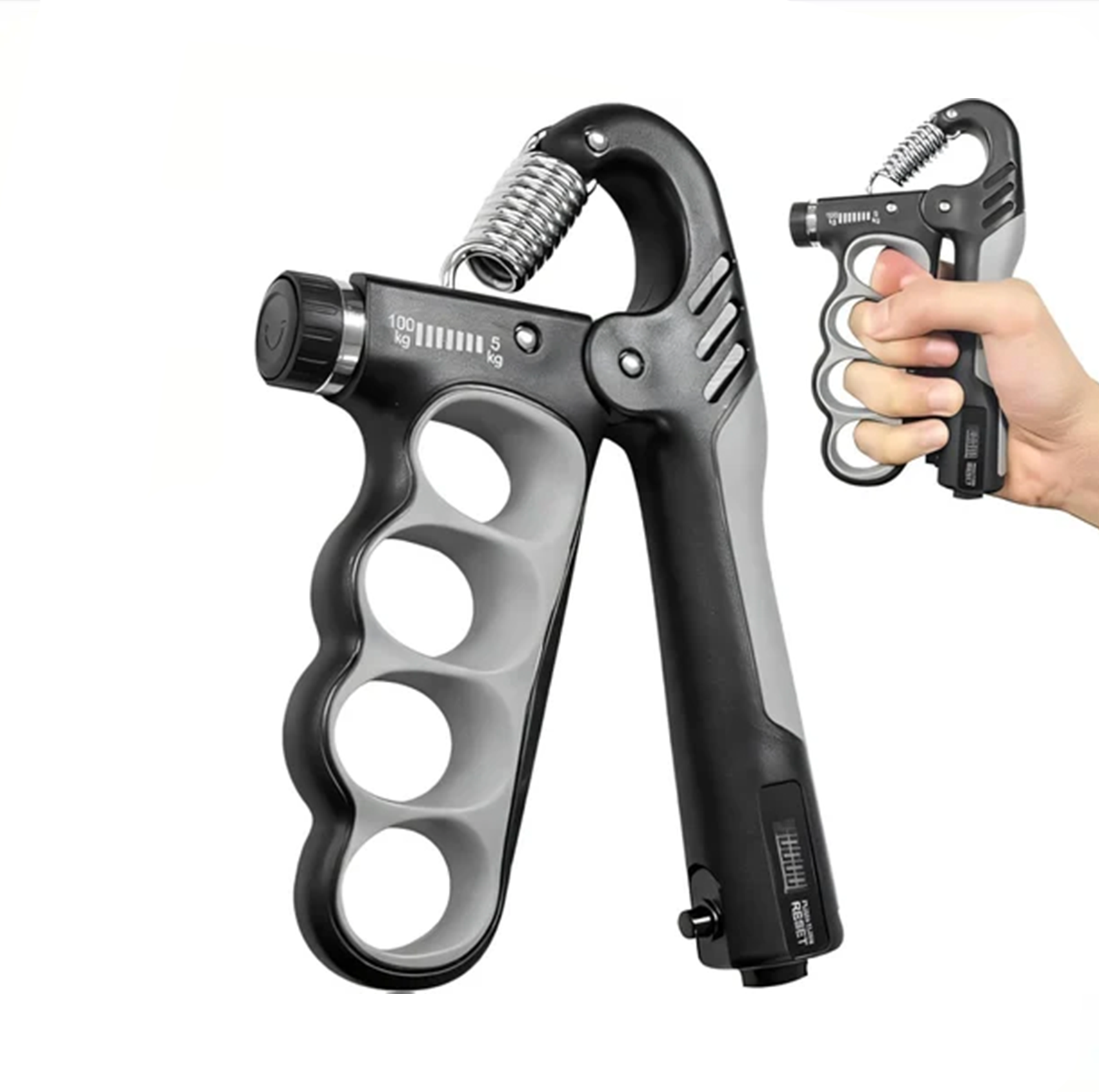 Träna greppstyrka, underarmar och fingrar med denna justerbara handtränare. 5–100 kg motstånd, inbyggd räknare och ergonomisk design – perfekt för träning, rehab och sport.