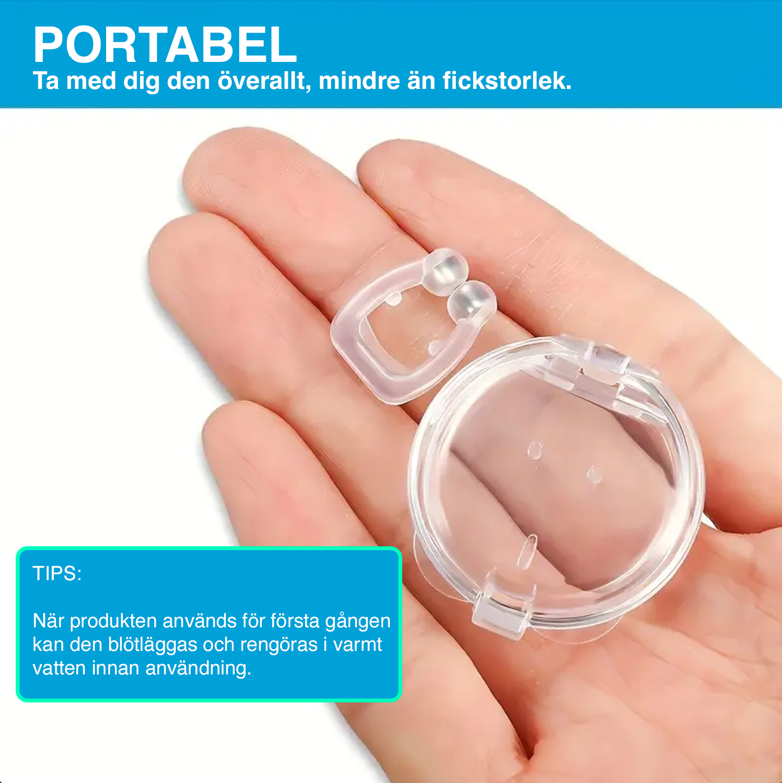 Produkten är lätt att använda, kräver varken el eller batterier, och är helt återanvändbar. Perfekt för dig som vill ha en naturlig och praktisk lösning på snarkning utan kemikalier eller komplicerade apparater. Paketet innehåller 6 näsklämmor, vilket gör det enkelt att alltid ha en till hands. Idealisk för både hemmabruk och resor. Investera i en bättre sömn för dig själv och din partner!