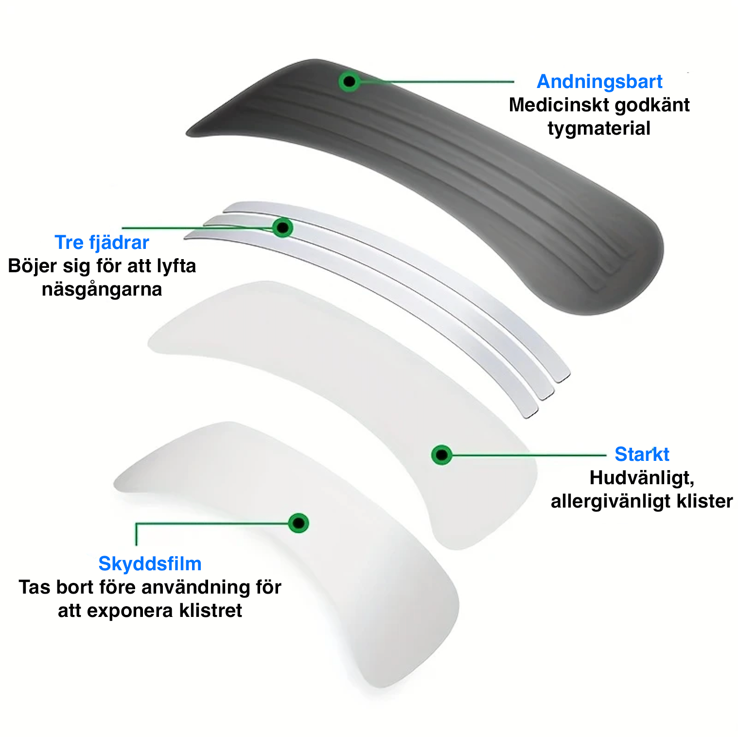 Perfekta för dig som lider av nästäppa, allergier, snarkning eller andningssvårigheter vid träning. Med en diskret design och hudvänligt, hypoallergent klister sitter de bekvämt på plats utan irritation. Den fjädrande effekten bidrar till att hålla näsan öppen utan läkemedel eller maskiner.
