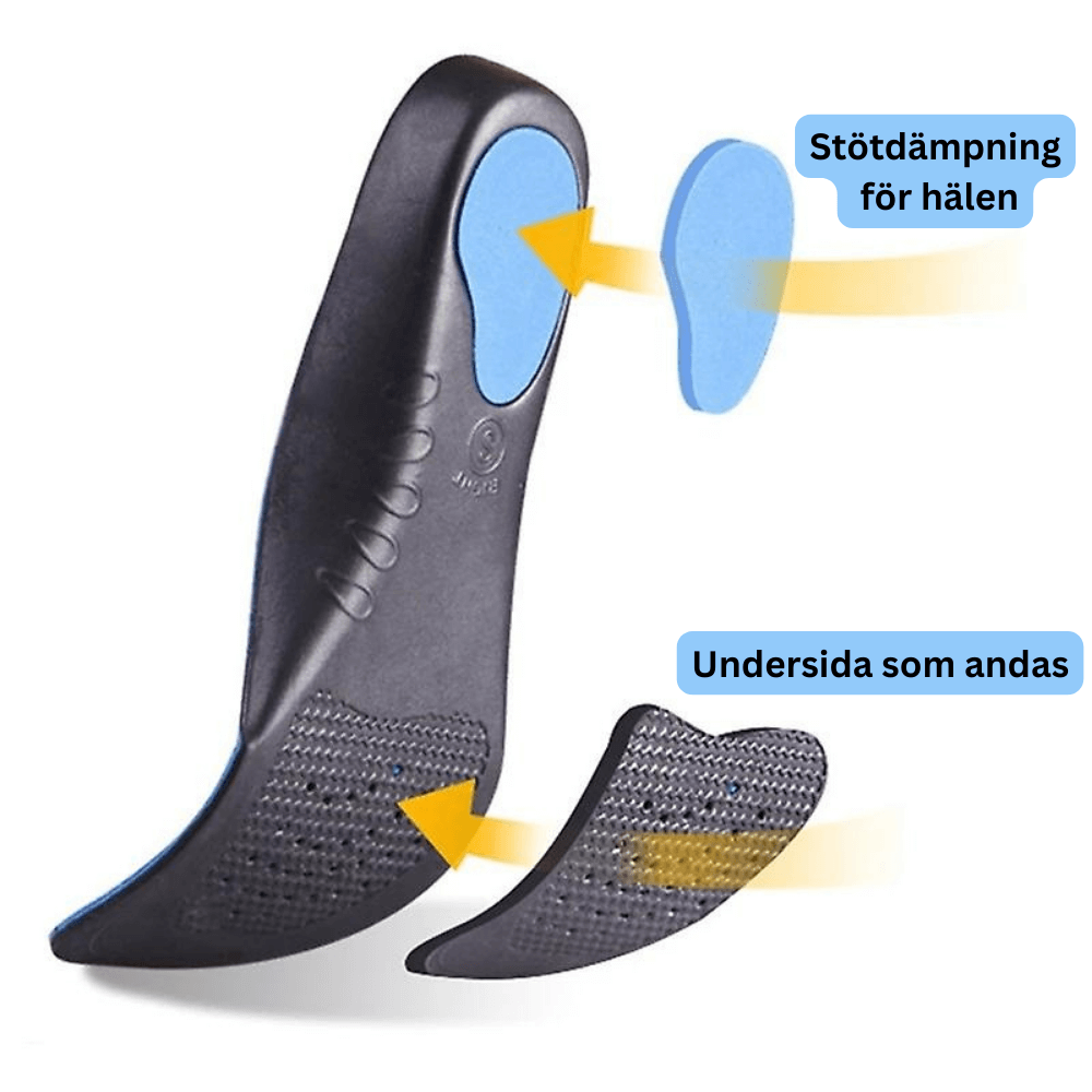Våra skoinlägg är designade för att motverka pronation och lindra hälsmärta genom att ge stabilt stöd och minska belastningen på fotens insida. Den mjuka ytan och den skålade hälen säkerställer en bekväm och naturlig känsla.